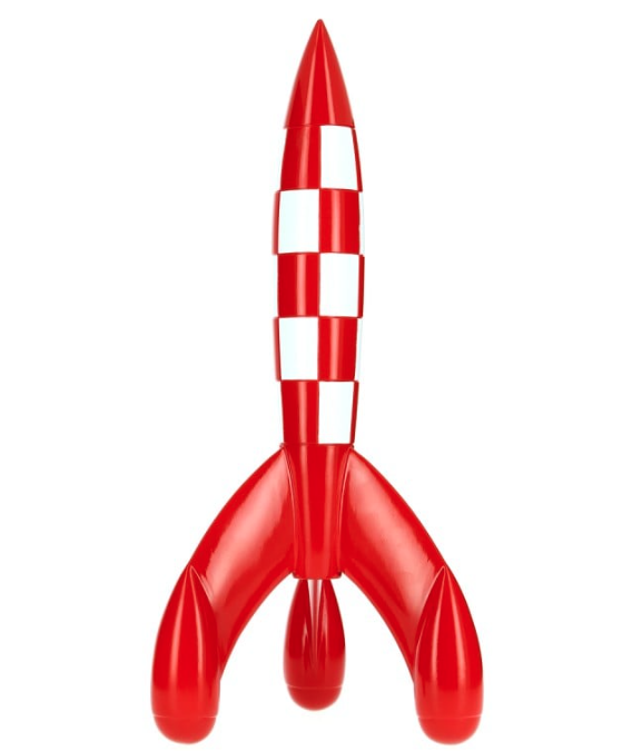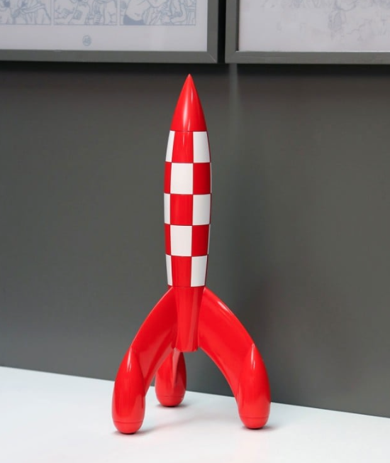 RESIN ROCKET 60cm. Hergé'in hiperresalist yönünü temsil etmenin ötesine geçip avrupa çizgi roman sanatının tamamı için ikon özelliği taşıyan kırmızı beyaz damalı roket