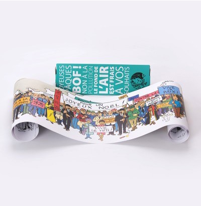 TENTEN - FRIEZE POSTER 1972 GREETINGS CARD 180X29cm. 200gr. Hergé tarafından 1972'de çizilen ve çoğu Tenten karakterinin yer aldığı poster renkli ve siyah/beyaz olarak çift taraflıdır.