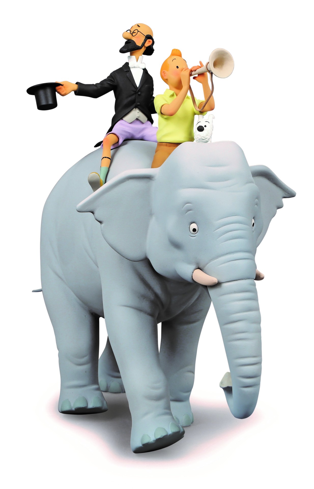 TINTIN AND PROFESSOR SICLONE ON THE ELEPHANT STATUE CIGARS OF THE PHARAOH - 1934 37cm. yüksekliğinde resin heykel. Üretim limiti 500 kopya ile sınırlıdır. Modelleme ve boyama dahil tüm üretim aşamaları Fariboles tarafından Fransa'da yapılmıştır.